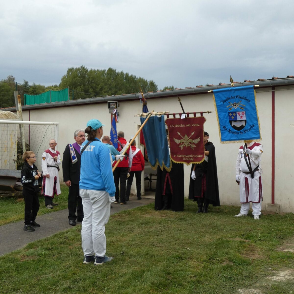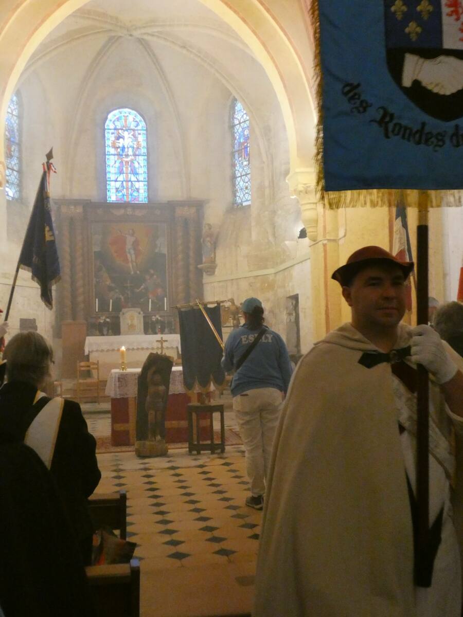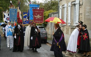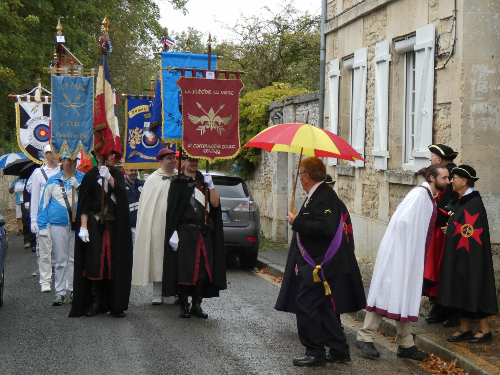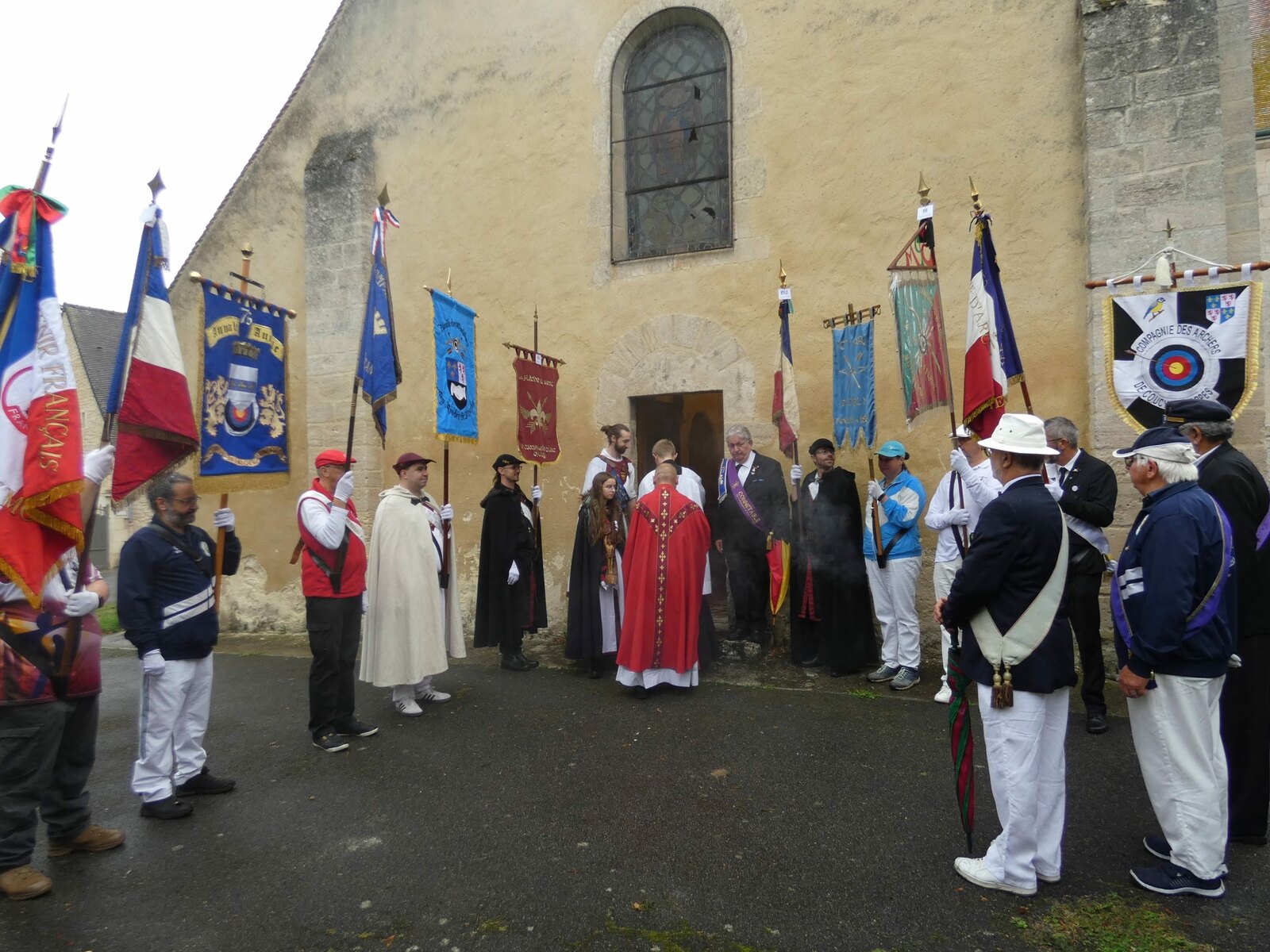 La journée a commencé sous une légère pluie, par une messe dédiée à St Sébastien et la bénédiction des drapeaux, puis ces derniers se sont rendus à la compagnie en cortège pour le salut des buttes.