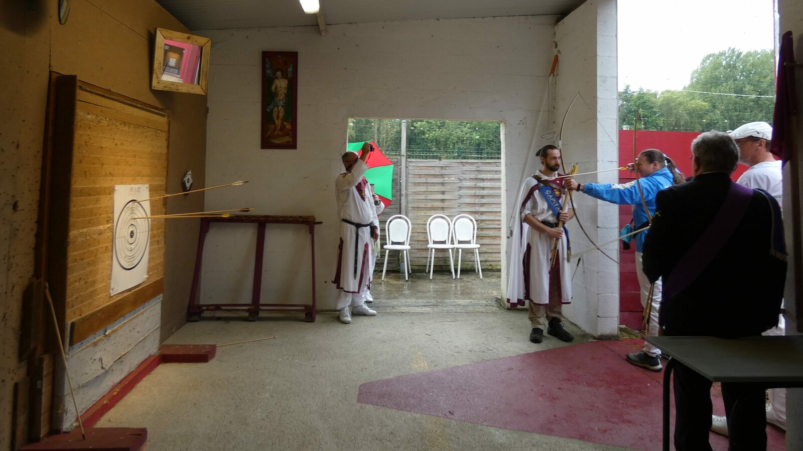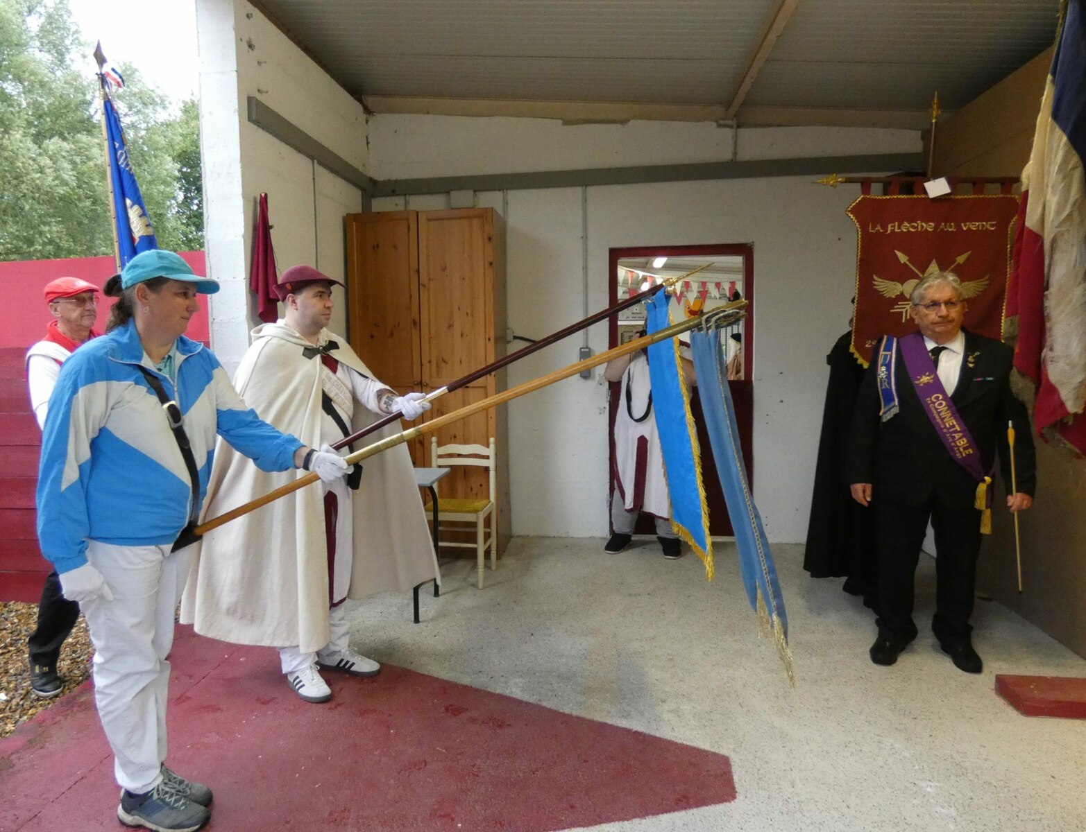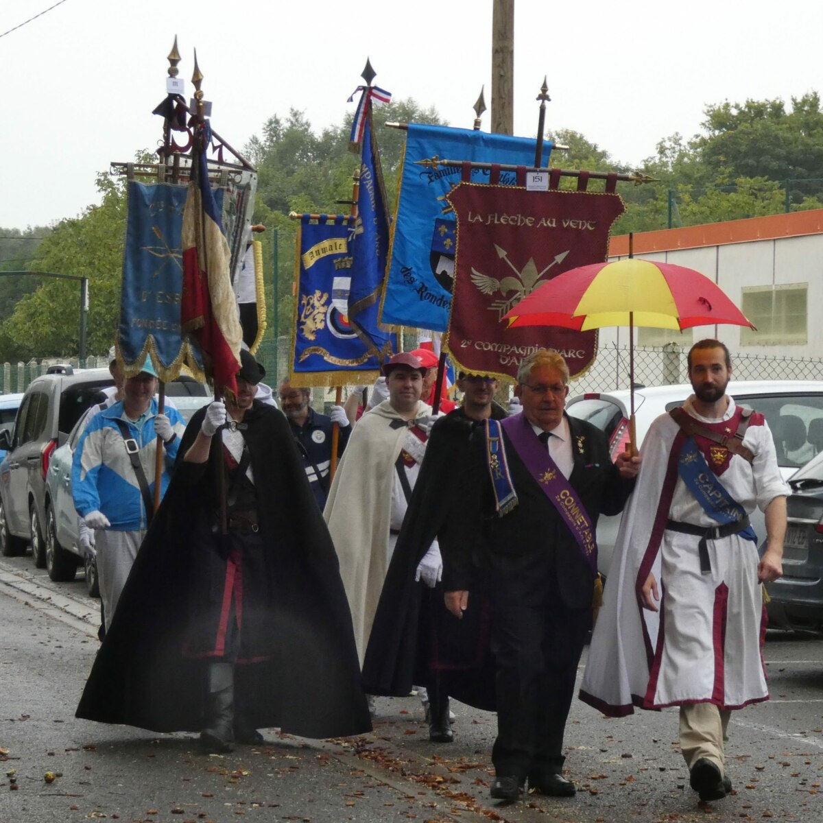 La journée a commencé sous une légère pluie, par une messe dédiée à St Sébastien et la bénédiction des drapeaux, puis ces derniers se sont rendus à la compagnie en cortège pour le salut des buttes.