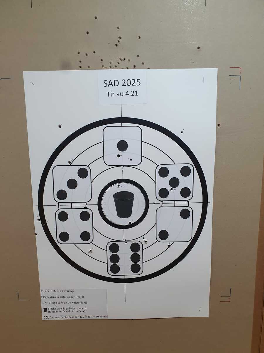 Alexandre, Marie France, Eric, Gregory, Anne, Thierry et Dorothée se sont lancés au 421 version tir à l'arc. Des dés sont imprimés sur une carte, chaque flèche marque la valeur des dés et la combinaison 4-2-1 vaut 30 points alors que le gobelet central vaut zéro point.