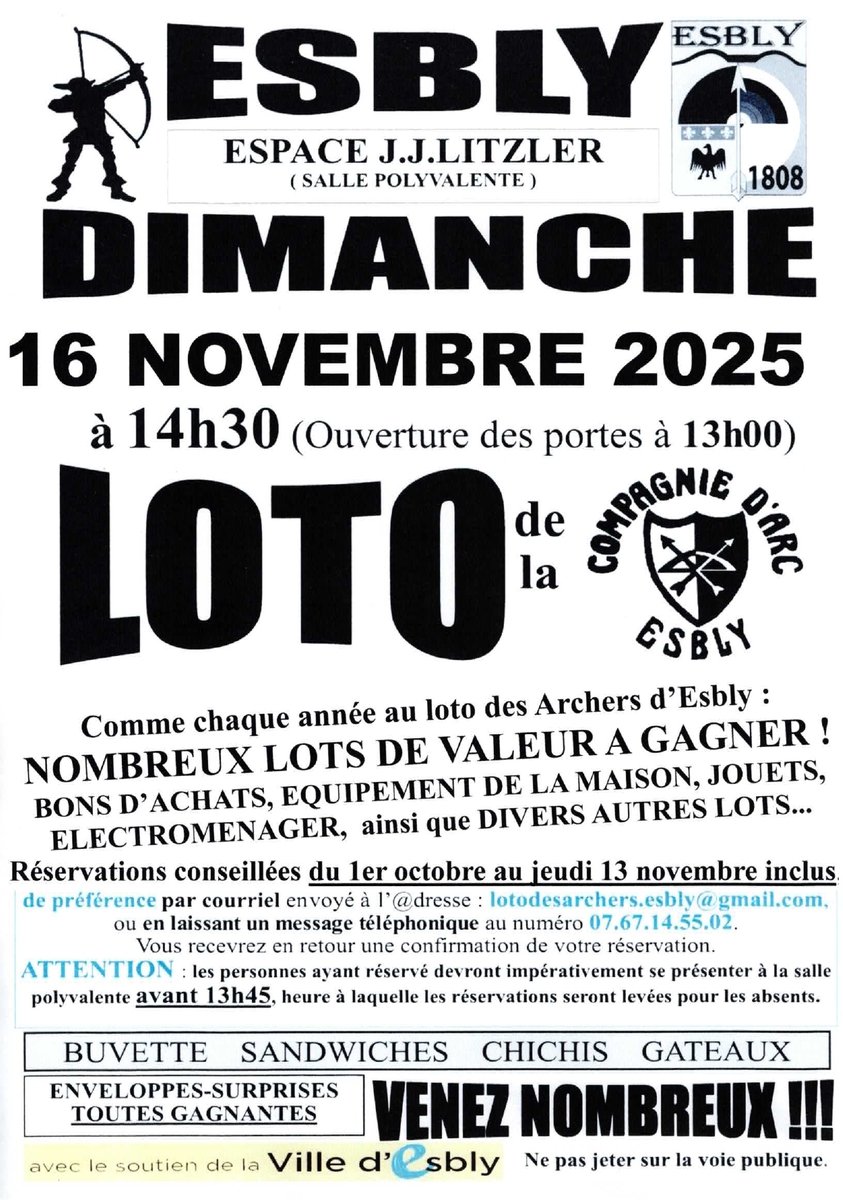 Nous vous accueillerons avec plaisir à notre loto des Archers d'Esbly. Vous pourrez repartir peut-être avec des beaux lots dont des bons d'achats et vous soutiendrez notre compagnie. Les gains nous permettent de financer des déplacements aux championnats de France , des achats de matériel entre autres. Une vente d'enveloppes toutes gagnantes sera aussi à disposition.